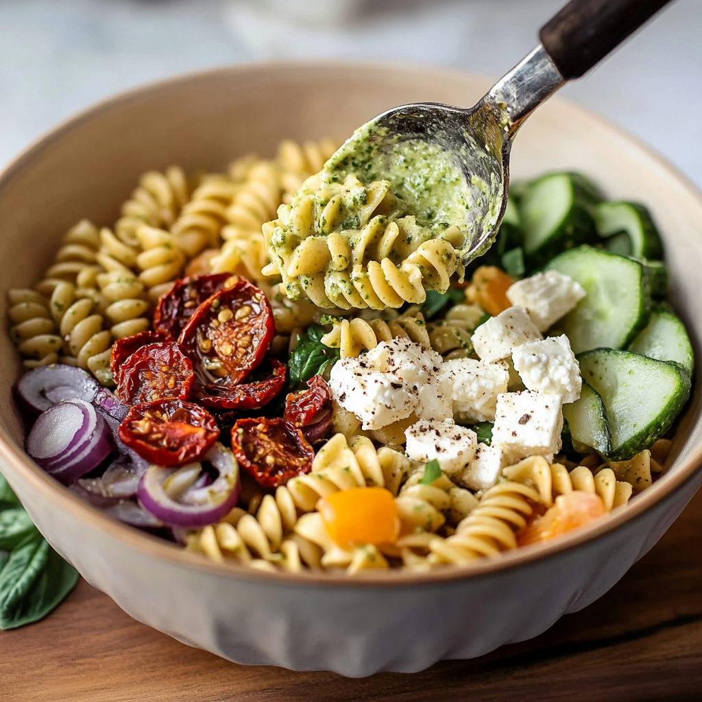 How to Serve Creamy Pesto Pasta Salad with Sun-Dried Tomato, Feta, and Mediterranean Veggies Recipe