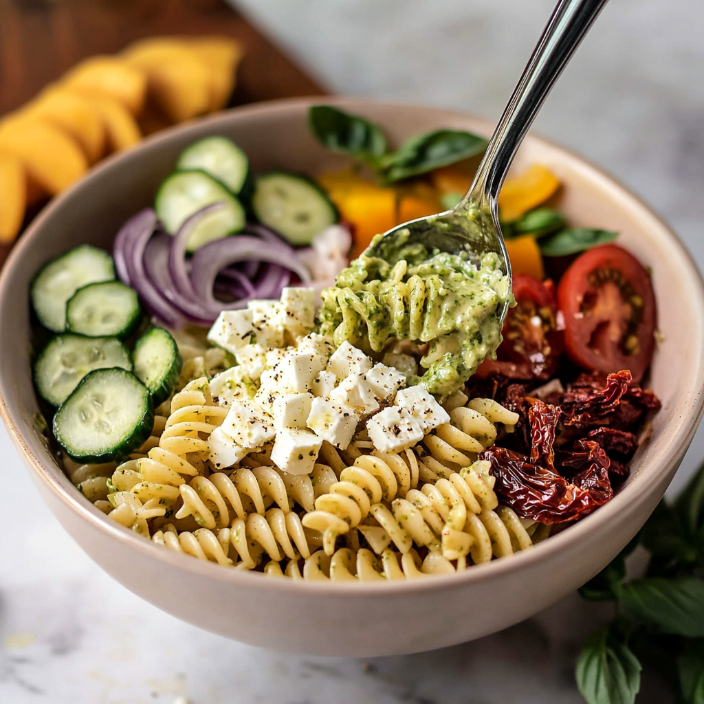 How to Make Creamy Pesto Pasta Salad with Sun-Dried Tomato, Feta, and Mediterranean Veggies Recipe